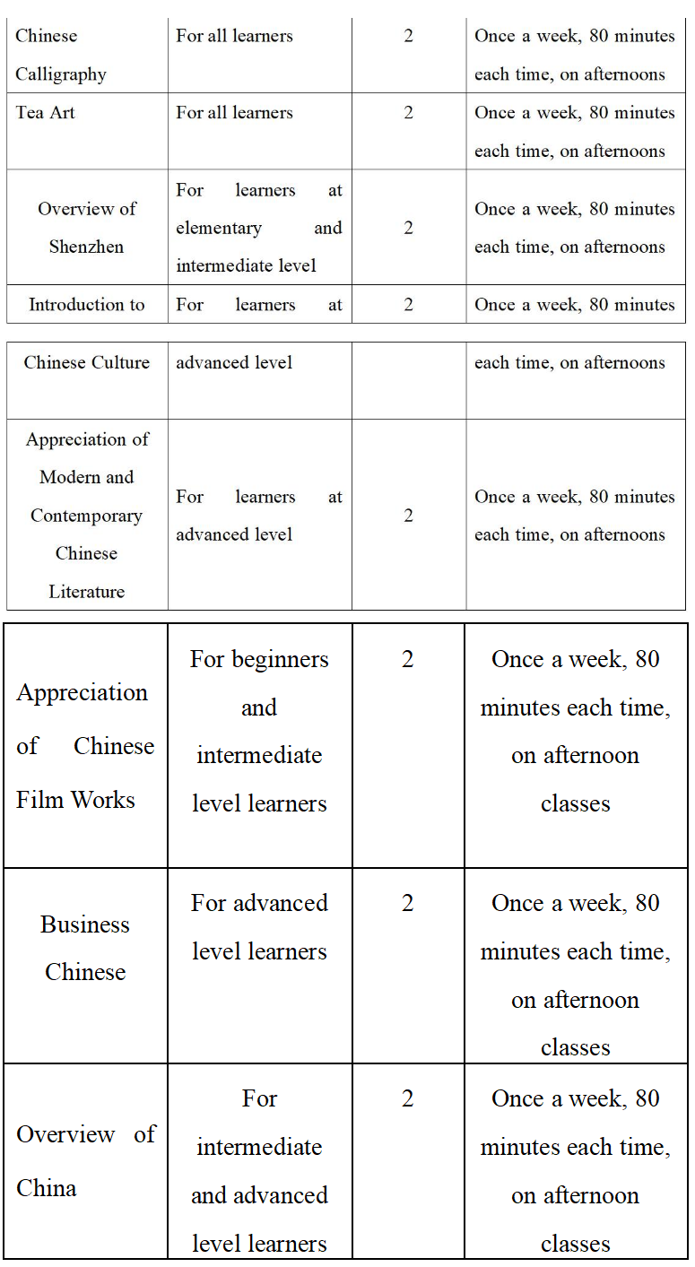 Chinese Communication for Beginners, Chinese Calligraphy, Tea Culture, Chinese Painting,Mandarin Pronunciation, Intensive Training on Chinese Characters, Chinese Corner, Appreciation of Chinese Film Works, Overview of Shenzhen, etc |