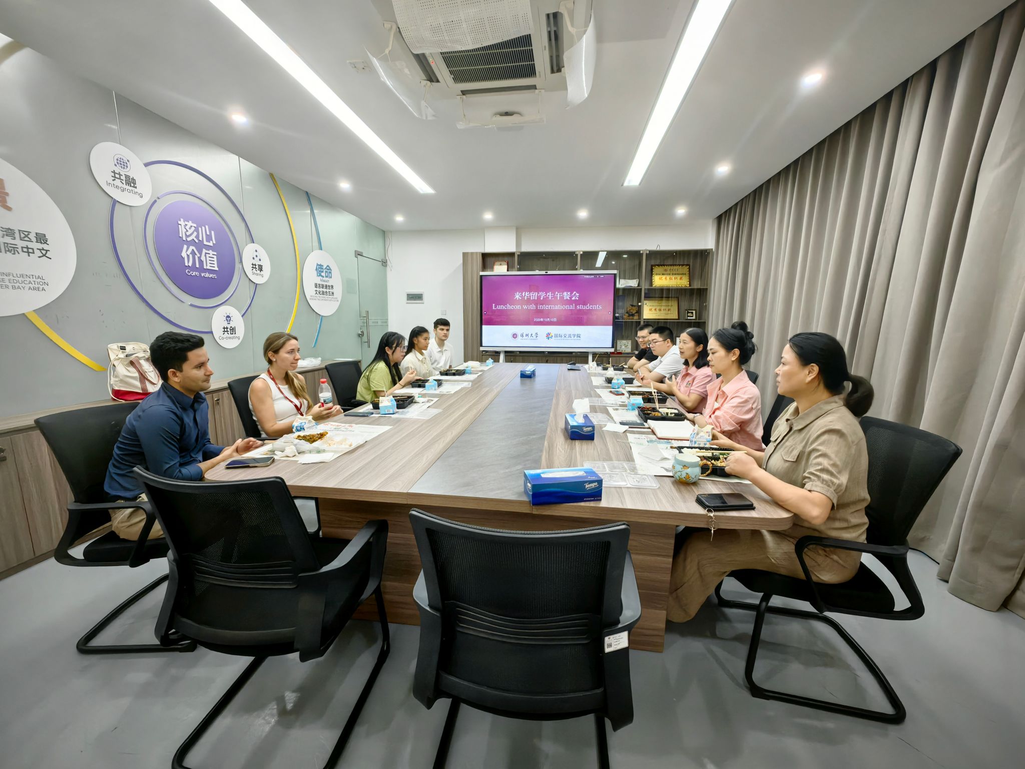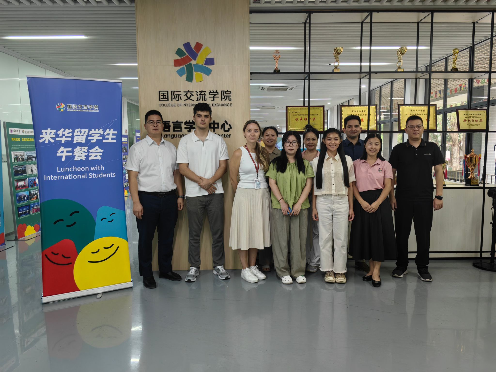 2025年10月10日中午,國際交流學院在學院二樓舉行來華留學生午餐座談會。國際交流學院副書記秦晴,物業經理謝邵城,學院老師劉威、李峰玲、董理珍與來自俄羅斯、巴基斯坦、烏茲別克斯坦、緬甸、菲律賓的5名新生代表圍坐暢談。午餐座談會由劉威老師主持。